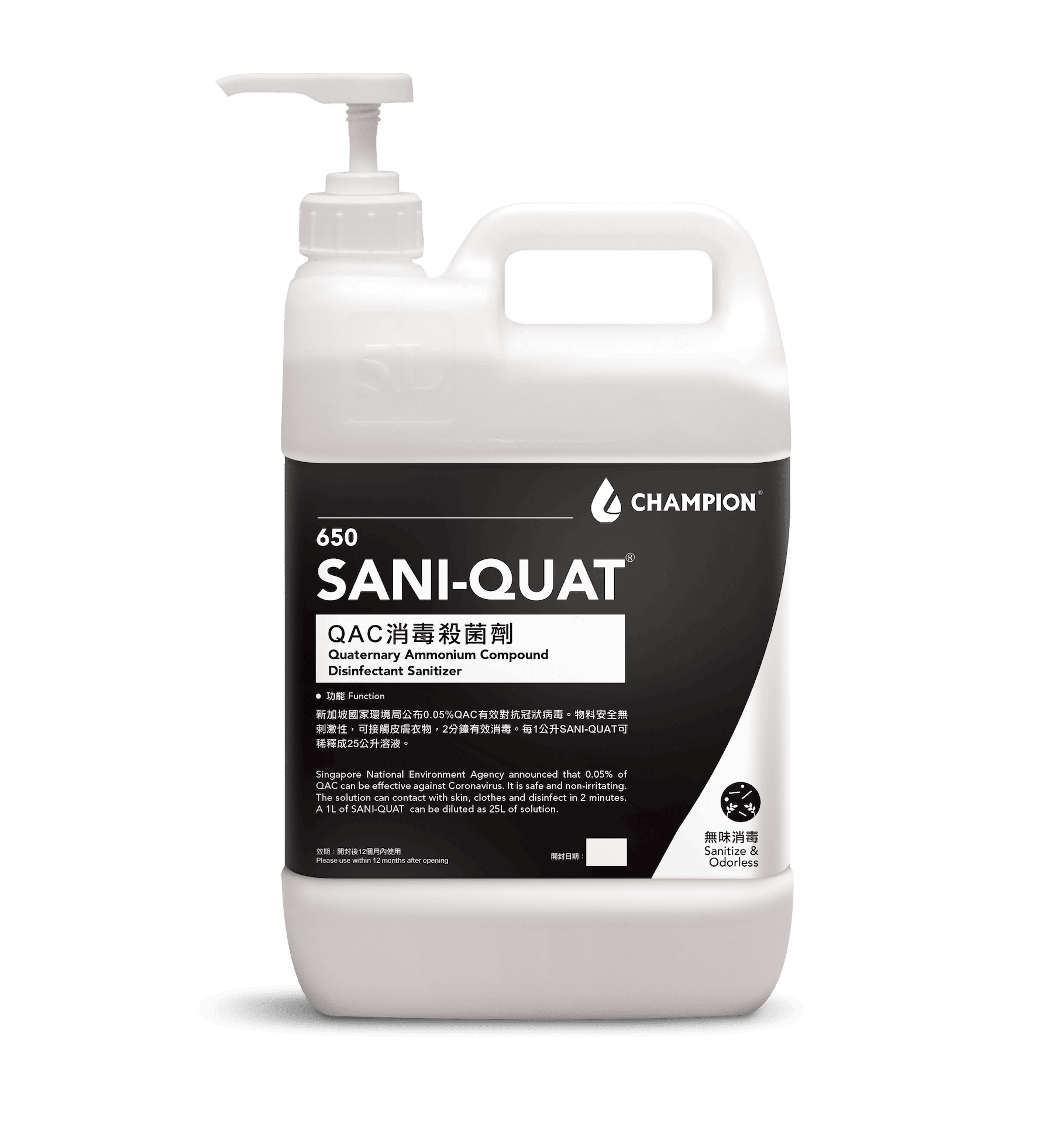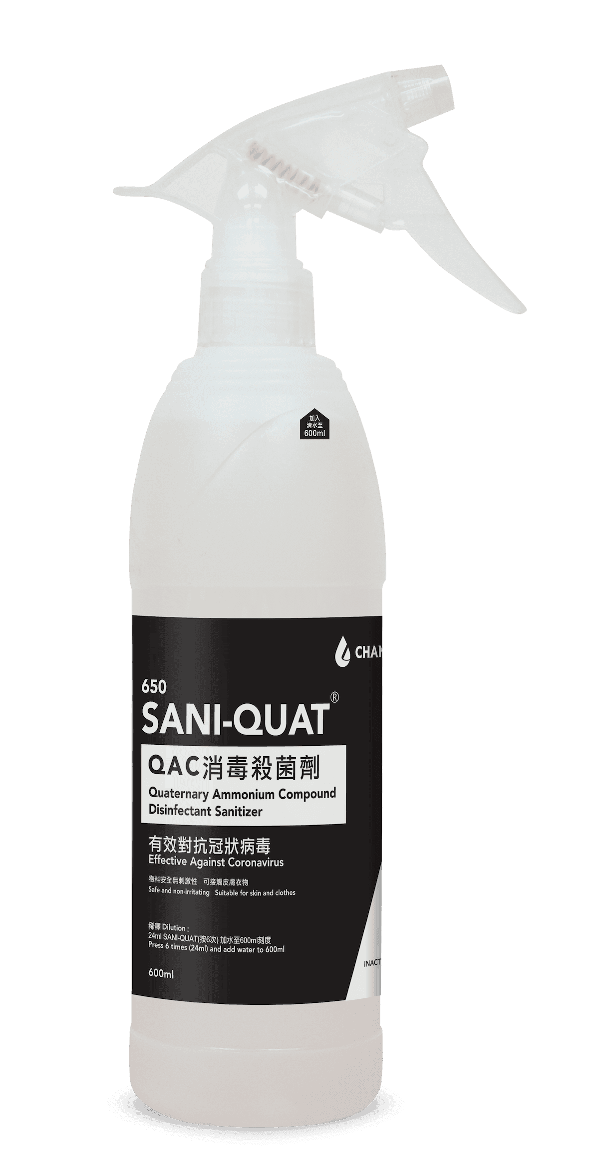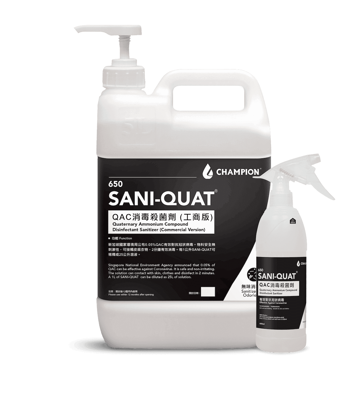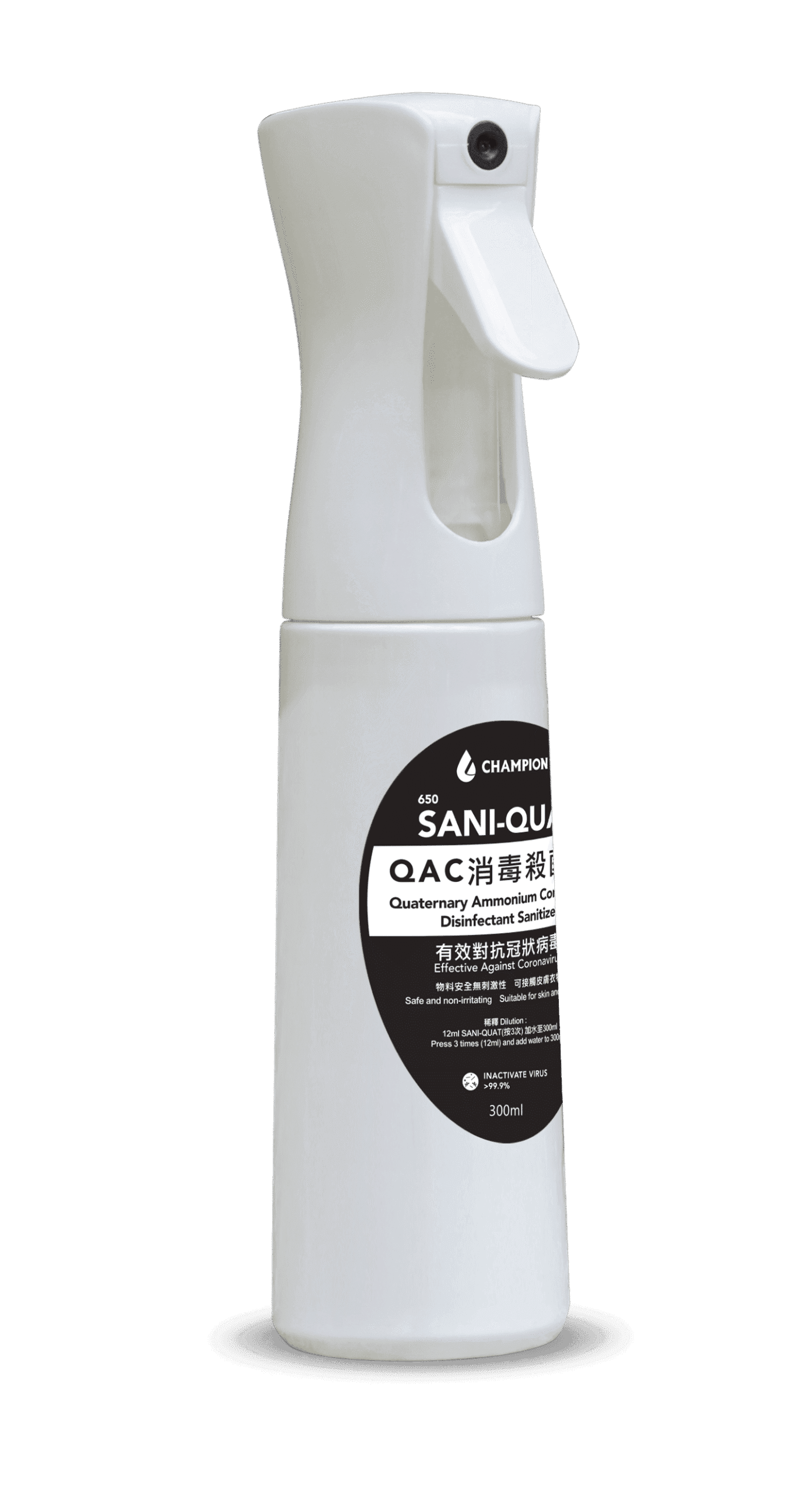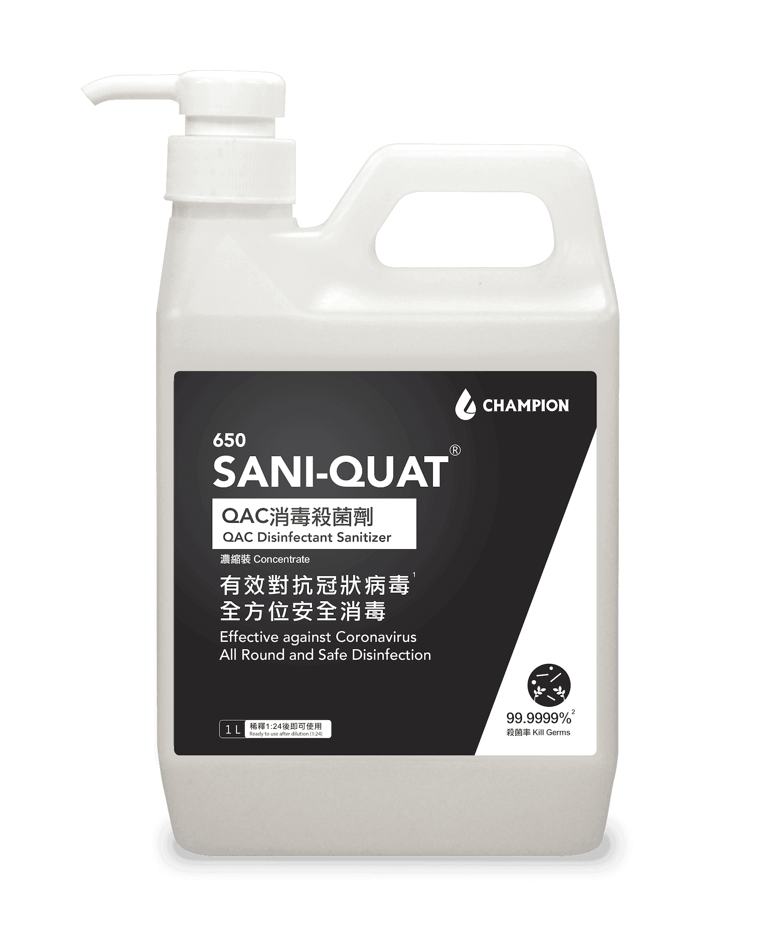 A professional-grade Quaternary Ammonium Compound (QAC) concentrated disinfectant and steriliser, proven by independent laboratory testing to effectively inactivate the novel coronavirus (COVID-19) (inactivation rate >99.99%) and a wide range of common pathogenic bacteria (kill rate >99.9999%). Its formula is non-toxic and non-irritating to skin, clothing, and various environmental surfaces. The ultra-concentrated design means that every 1 litre can be diluted to make 25 litres of disinfectant solution, making it the ideal choice for combining top-tier protection with ultimate cost-effectiveness.