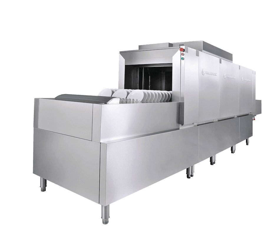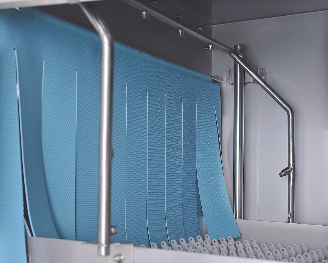 配備專用不鏽鋼輸送帶,結合環迴烘乾、專利熱回收及預洗除渣技術,能有效處理多款餐具並即時烘乾。採用變頻式輸送系統,按清洗量及需求自動調節,防止過載,確保穩定高效運作。