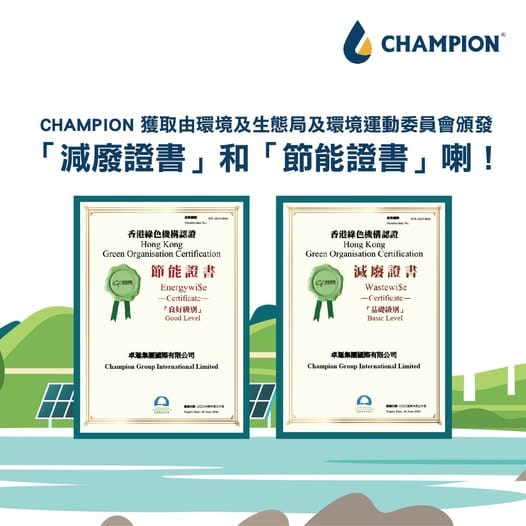 CHAMPION 獲頒「香港綠色機構認證」「減廢證書」及「節能證書」!