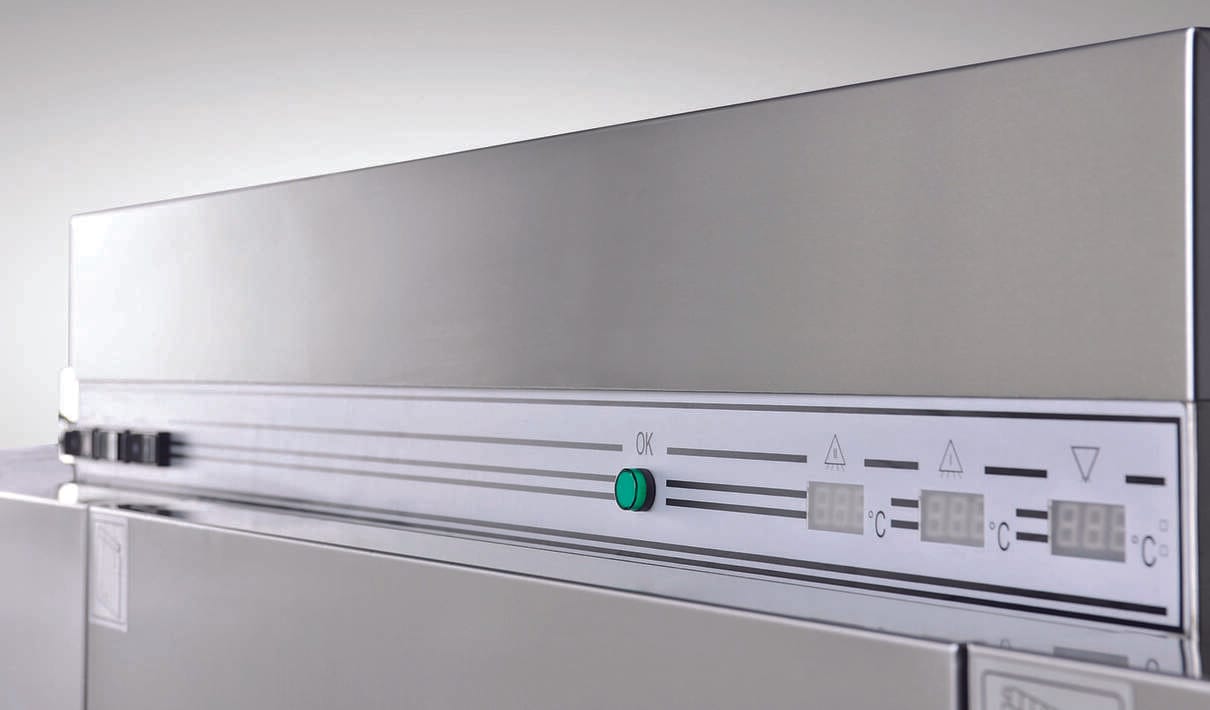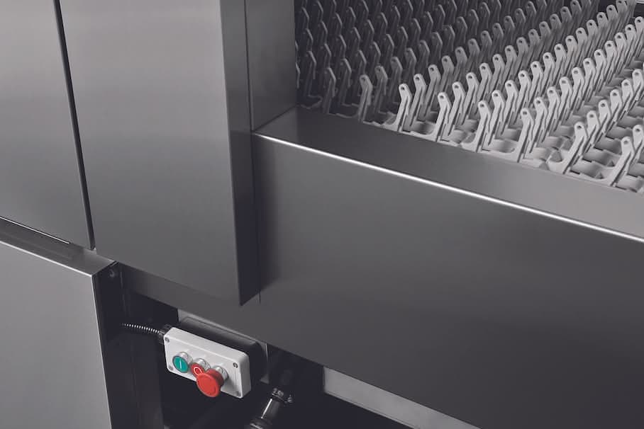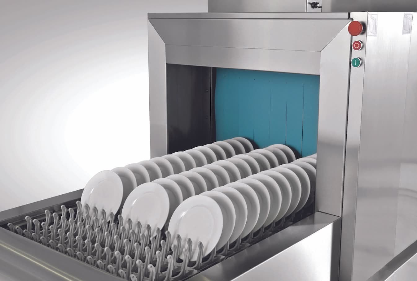 配備專用不鏽鋼輸送帶,結合環迴烘乾、專利熱回收及預洗除渣技術,能有效處理多款餐具並即時烘乾。採用變頻式輸送系統,按清洗量及需求自動調節,防止過載,確保穩定高效運作。
